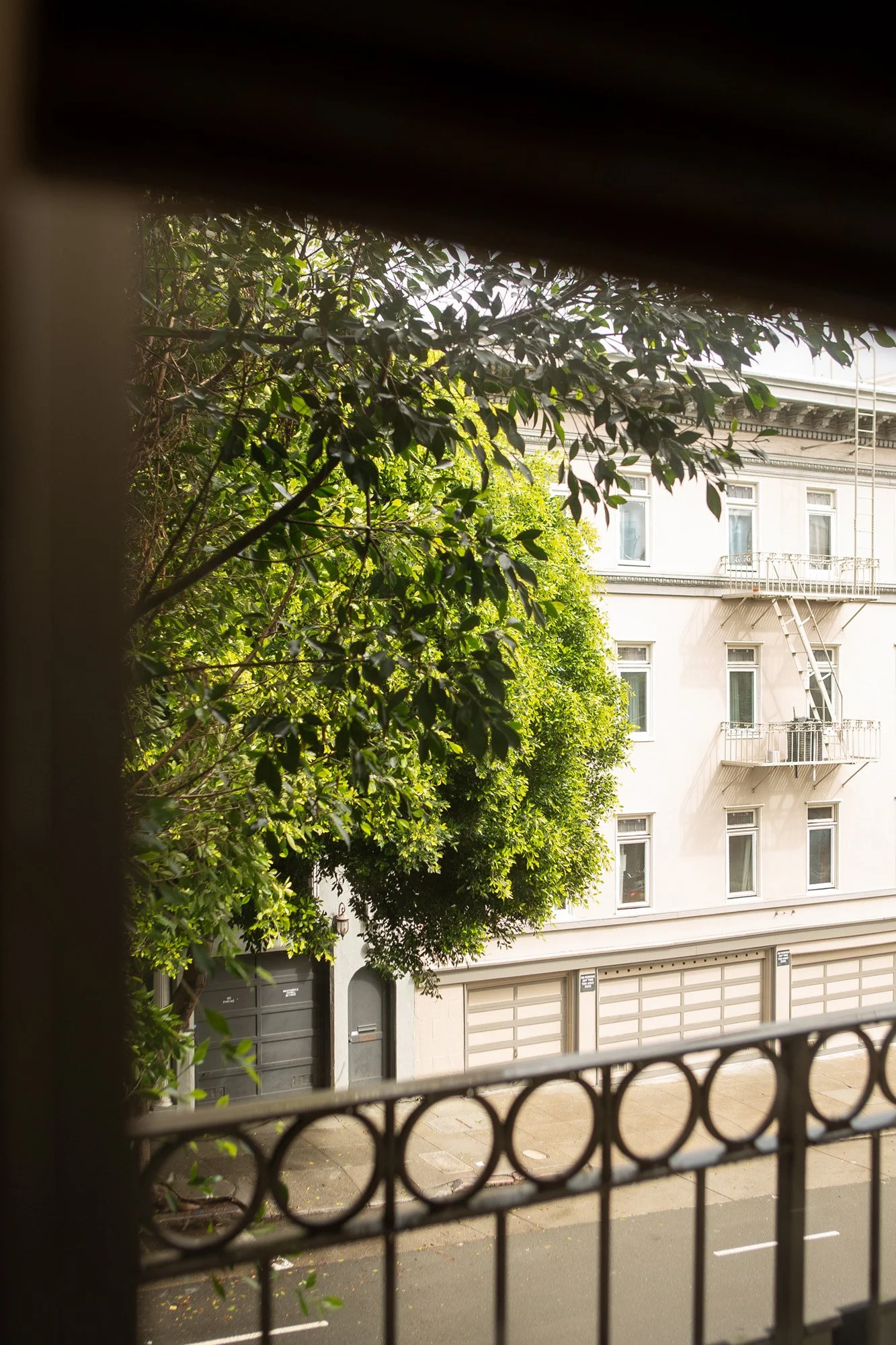 By evening the neighborhood settles into its own rhythm. The cable car passes at a familiar interval, its bell carried on the air before it arrives. The light on the buildings goes warm and the street quiets without going silent.